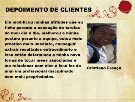 Depoimentos são apenas palavras, mas a experiência e o sentimento são comprovações. Confira na Galeria de fotos a opinião de alguns clientes que já passaram por um processo de Coaching com o Coach Leandro Cristo.